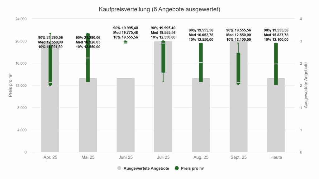 - Juni 2025: 2 Angebote, Medianpreis 19.775,48 €/m² – der Höchstwert der Serie.